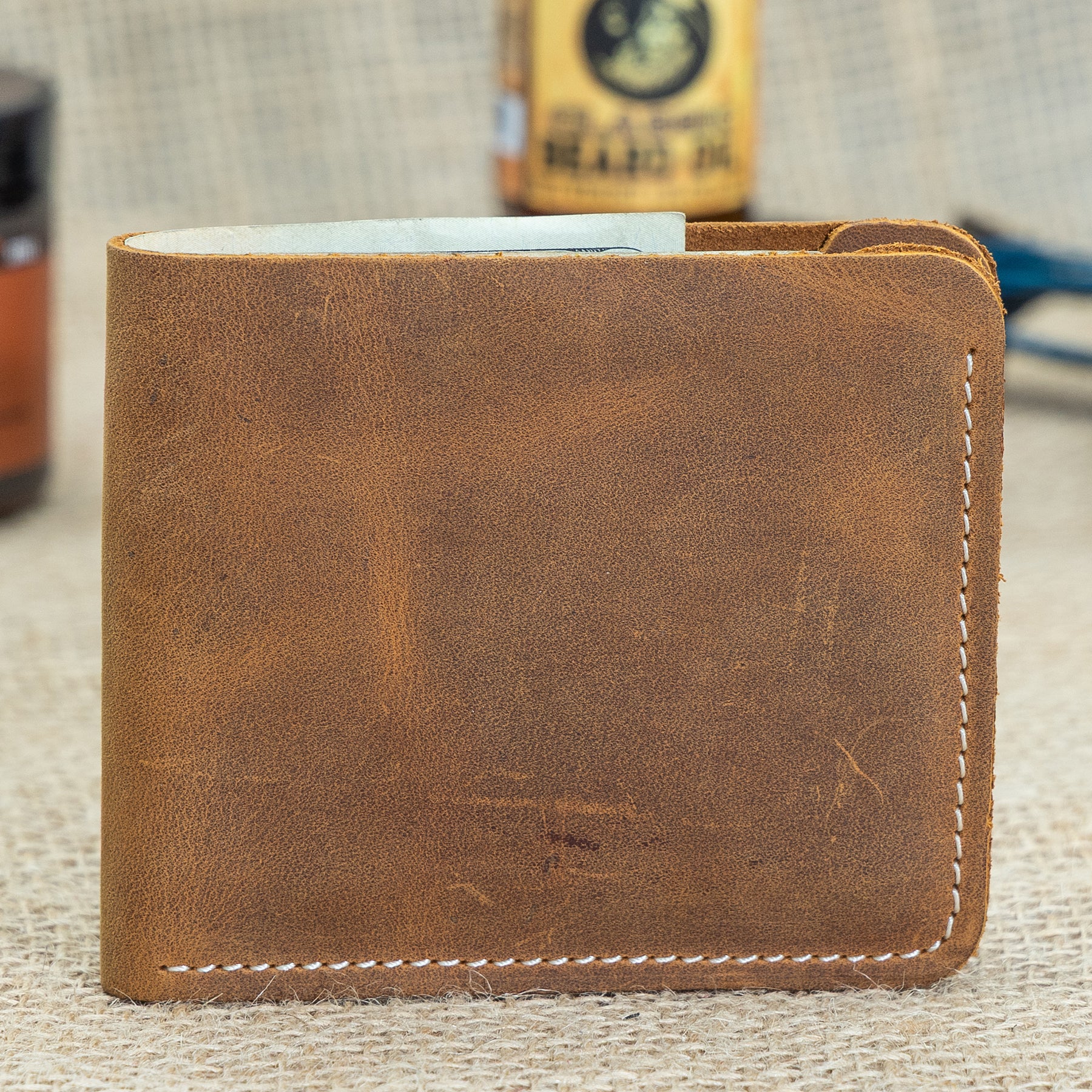 Brown leather wallet on a textured surface with a blurred background