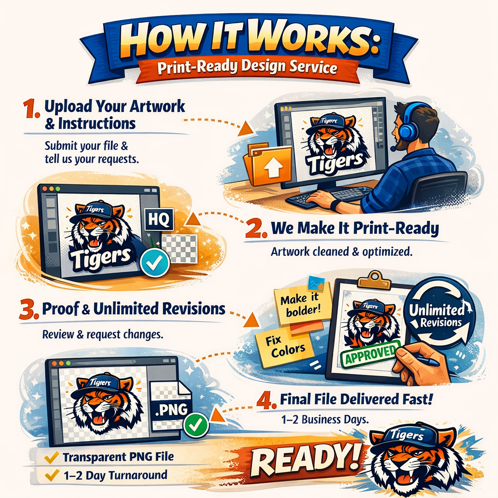 We prepare it for printOur team redraw or edit the design, checks resolution, and makes it print-ready.